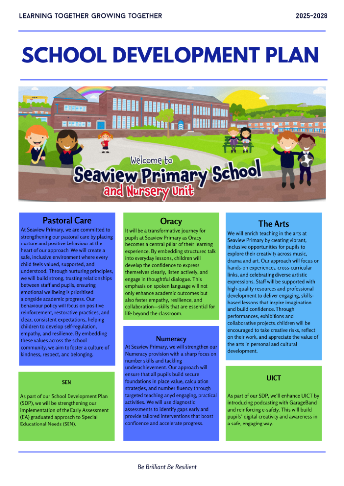 At Seaview Primary School, our School Development Plan sets out clear priorities to ensure high-quality teaching, learning, and pupil well-being. It reflects our commitment to continuous improvement and aligns with the Northern Ireland Education Authority and Department of Education guidance. Each priority is underpinned by measurable targets and strategies to help us achieve our vision for every child.